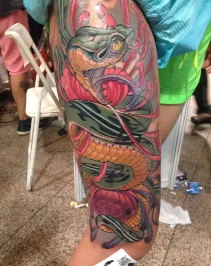• T网红王老大花腿龙纹身图片_腿部新传统纹身图案