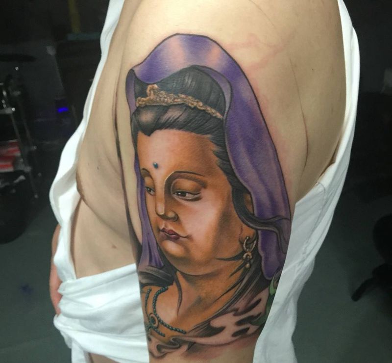 南无观世音菩萨纹身图片_肖像传统写实成品肩部手臂人物鬼神宗教国画纹身图案