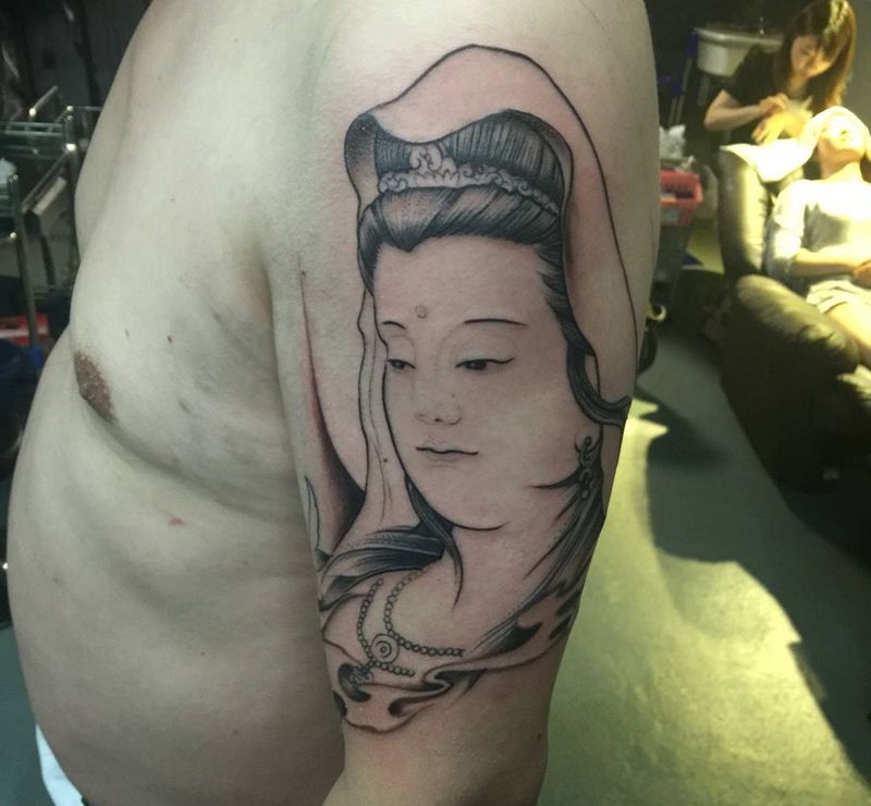 当前位置: 首页 >上海市纹身店-上海任刺青纹身工作室纹身图案>南无观世音菩萨纹身图片_肖像传统写实成品肩部手臂人物鬼神宗教国画纹身图案