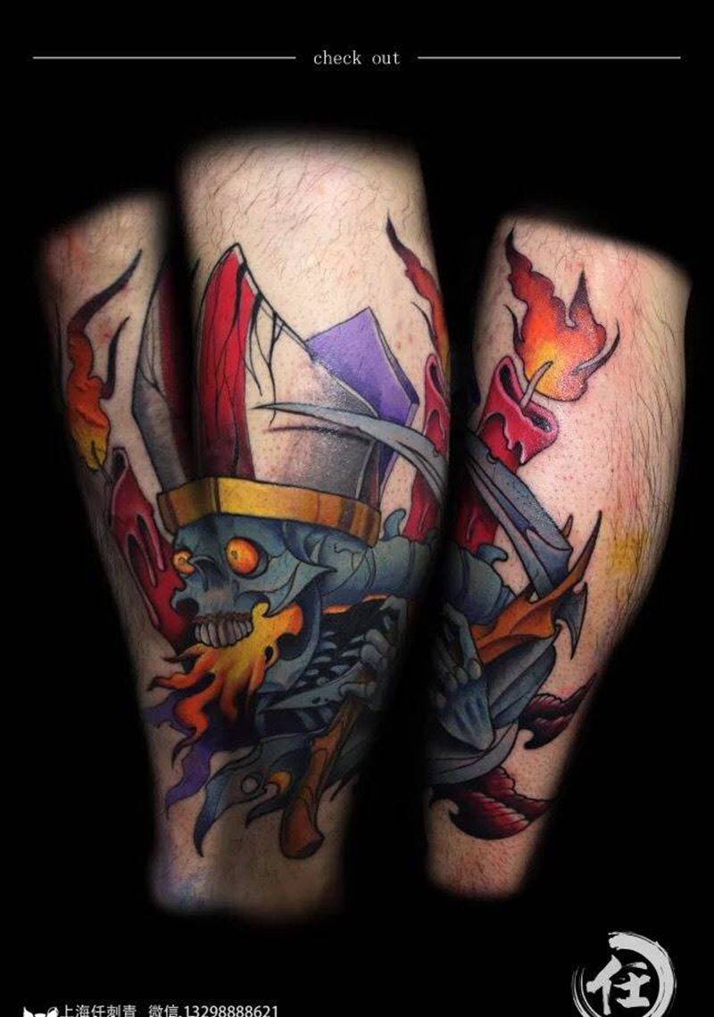 • T包小腿吹火男+阿多福纹身图片_腿部老传统新传统吹火男阿