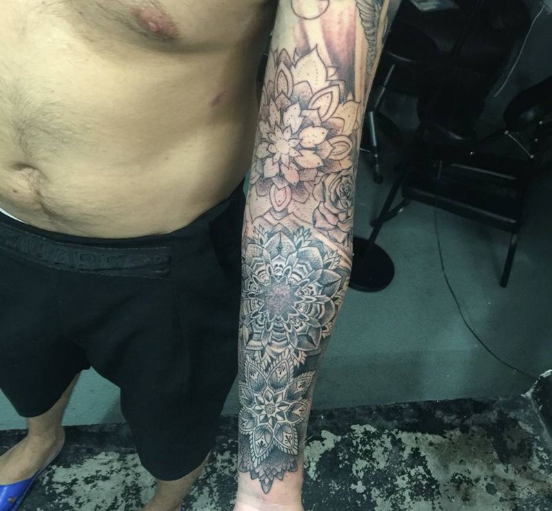 当前位置: 首页 >上海市纹身店-上海任刺青纹身工作室纹身图案>曼陀罗花天使点刺花臂纹身图片_成品手臂手部写实欧美人物几何图腾原创宗教纹身图案