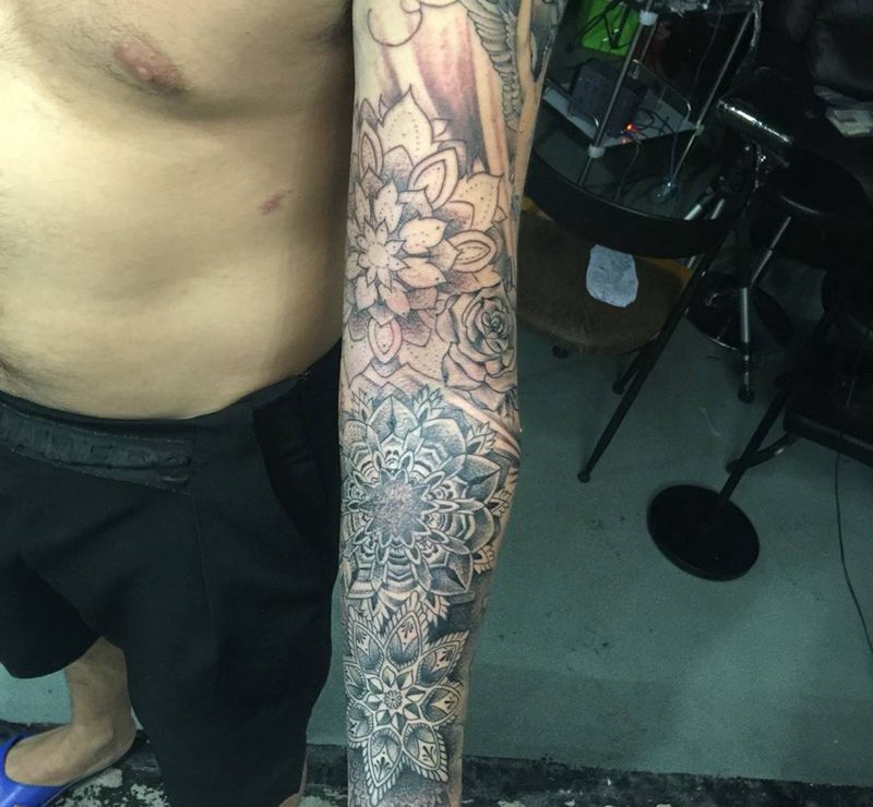 当前位置: 首页 >上海市纹身店-上海任刺青纹身工作室纹身图案>曼陀罗花天使点刺花臂纹身图片_成品手臂手部写实欧美人物几何图腾原创宗教纹身图案