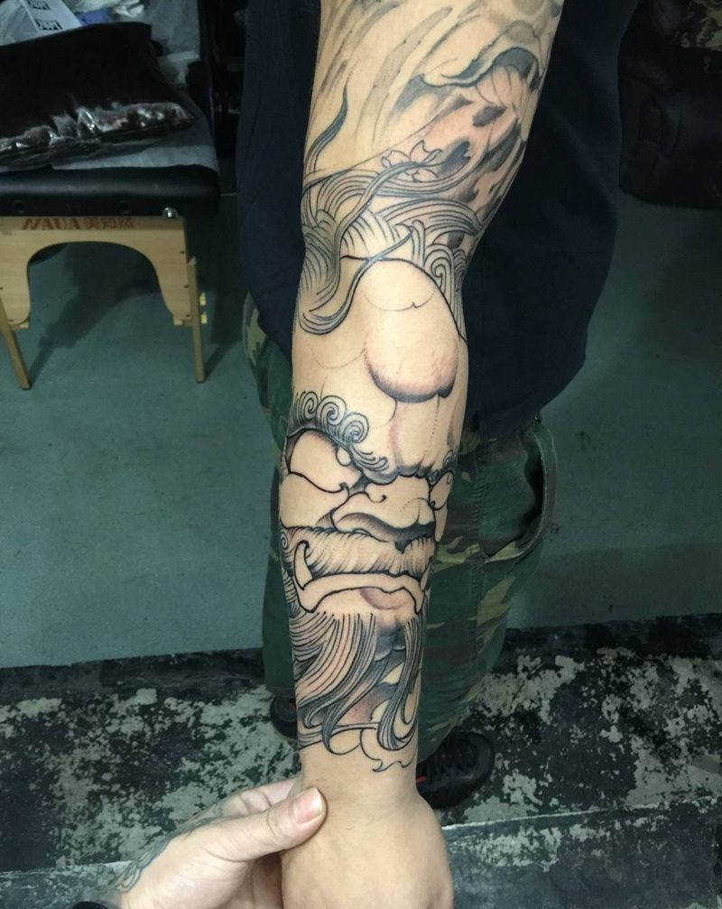 当前位置: 首页 >上海市纹身店-上海任刺青纹身工作室纹身图案>唐狮达摩蛋纹身图片_人物动物传统国画成品手臂肩部原创宗教手部纹身图案