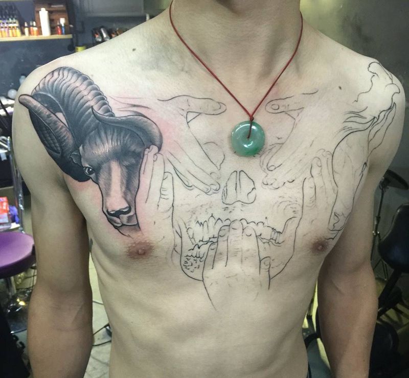 羊头鹿头骷髅头,纹身图片_欧美写实成品胸部腹部腰部原创动物宗教鬼神纹身图案