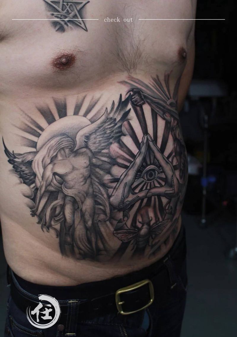 天使之虐恋纹身图片_欧美写实成品腹部腰部人物鬼神宗教原创肖像纹身图案