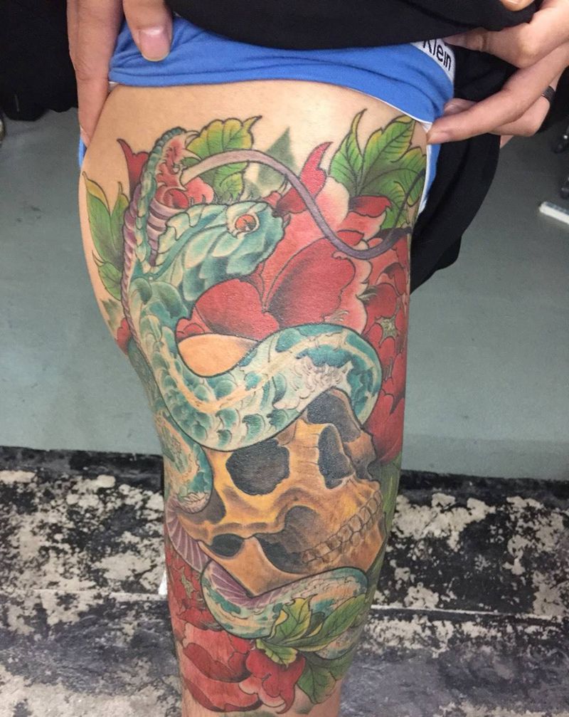 • T网红王老大花腿龙纹身图片_腿部新传统纹身图案