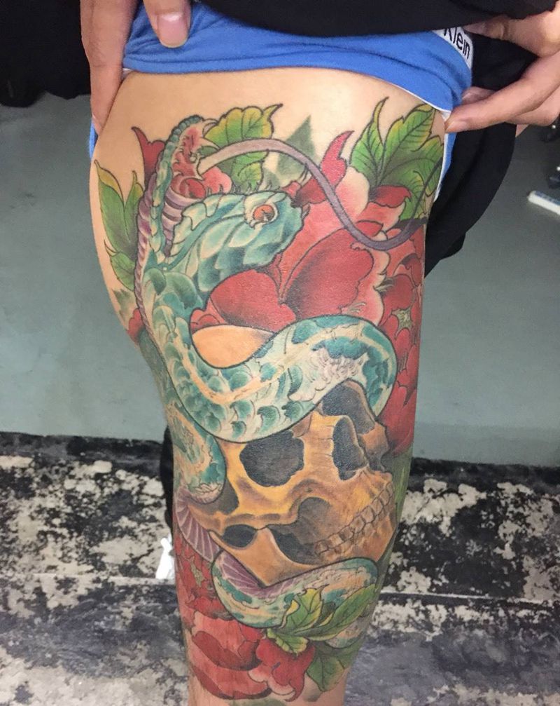 • T网红王老大花腿龙纹身图片_腿部新传统纹身图案