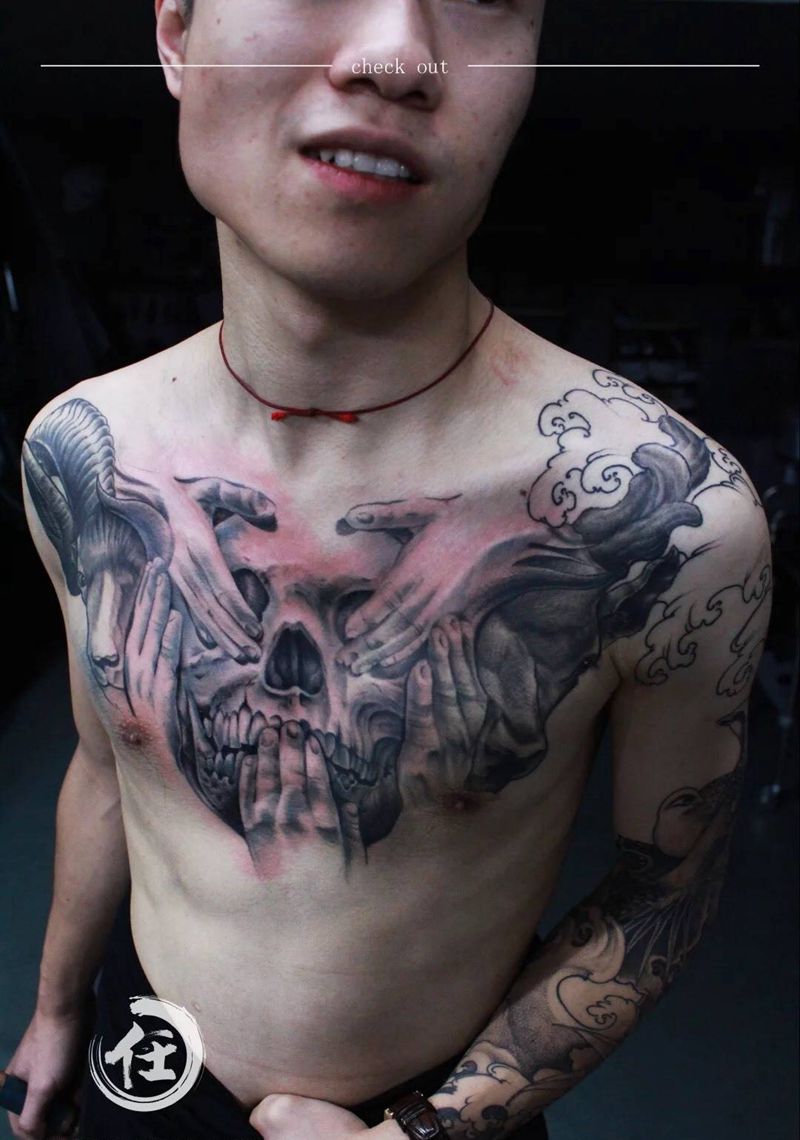 当前位置: 首页 >上海市纹身店-上海任刺青纹身工作室纹身图案>骷髅鹿羊胸花纹身图片_成品胸部腹部背部腰部欧美写实原创动物人物纹身图案