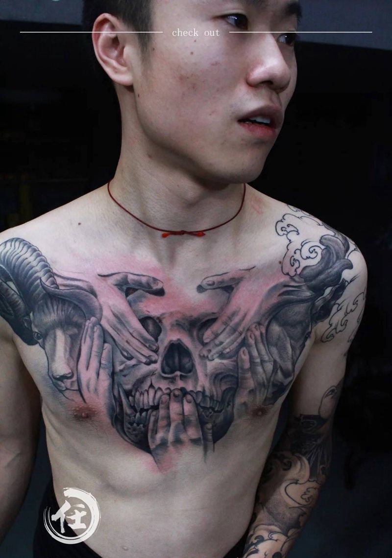 当前位置: 首页 >上海市纹身店-上海任刺青纹身工作室纹身图案>骷髅鹿羊胸花纹身图片_成品胸部腹部背部腰部欧美写实原创动物人物纹身图案