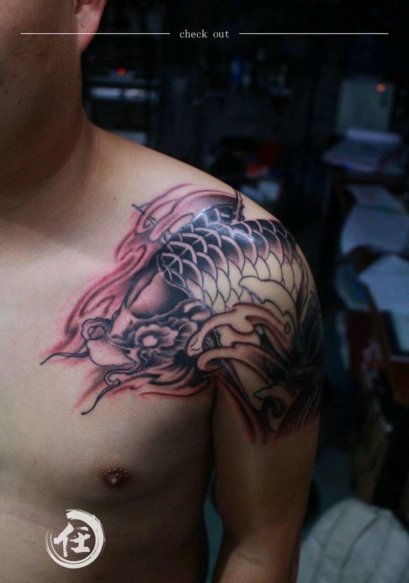 鲤鱼遮盖纹身图片_肩部传统动物原创成品纹身图案