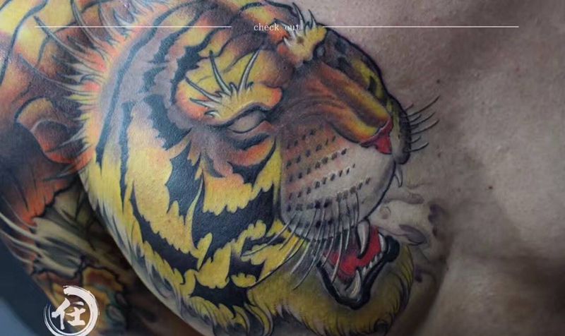 当前位置: 首页 >上海市纹身店-上海任刺青纹身工作室纹身图案>云中虎完工纹身图片_成品手稿胸部传统原创动物鬼神纹身图案