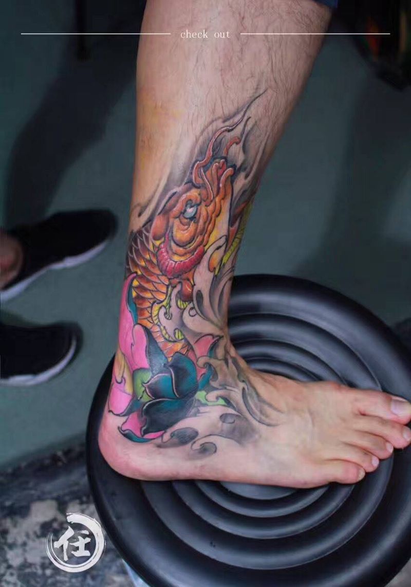 鲤鱼遮盖纹身图片_成品原创动物鬼神传统国画腿部脚部纹身图案
