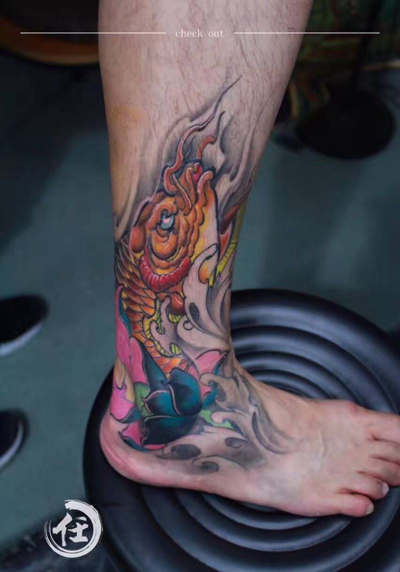 当前位置: 首页 >上海市纹身店-上海任刺青纹身工作室纹身图案>鲤鱼遮盖纹身图片_成品原创动物鬼神传统国画腿部脚部纹身图案