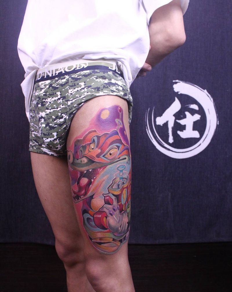 • T网红王老大花腿龙纹身图片_腿部新传统纹身图案