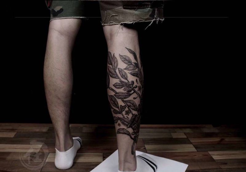 当前位置: 首页 >上海市纹身店-上海任刺青纹身工作室纹身图案>原创小腿咖啡叶纹身图片_腿部脚部几何点刺咖啡叶植物纹身图案