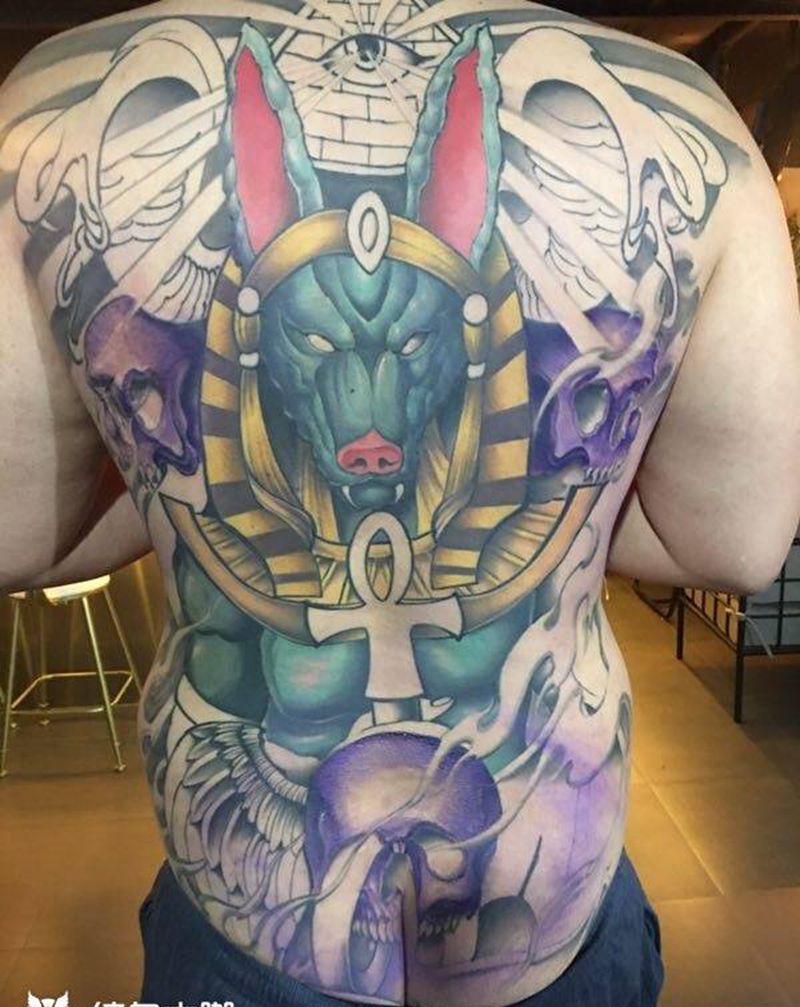 满背彩色阿努比斯埃及风纹身图片
