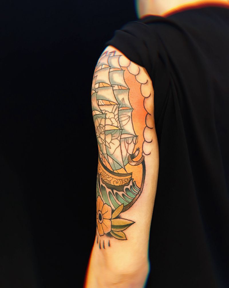 当前位置: 首页 >上海市纹身店-上海懟匠刺青工作室纹身图案>old school帆船纹身图片_手臂Old School纹身图案