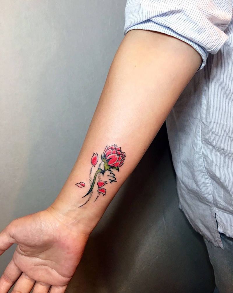 手臂 玫瑰花纹身图片_手臂水彩点刺花英文纹身图案