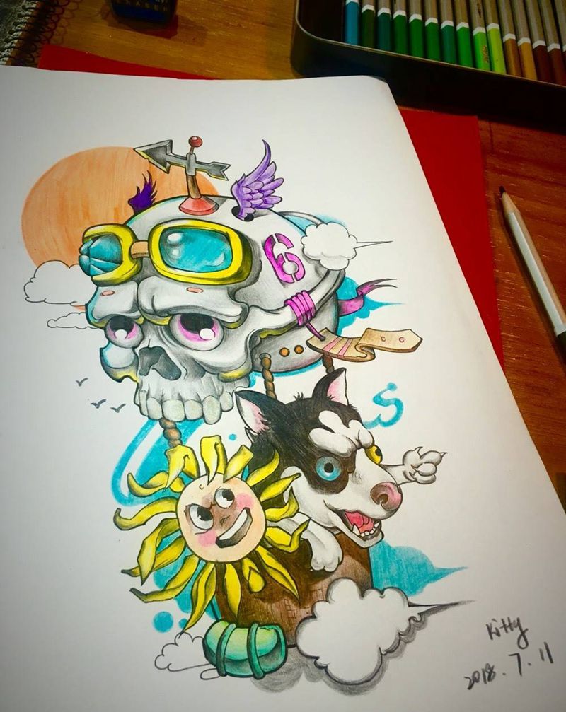 当前位置: 首页 >上海市纹身店-上海王牌刺青纹身图案>哈士奇 骷髅 向日葵纹身图片_手稿手臂腿部纹身图案
