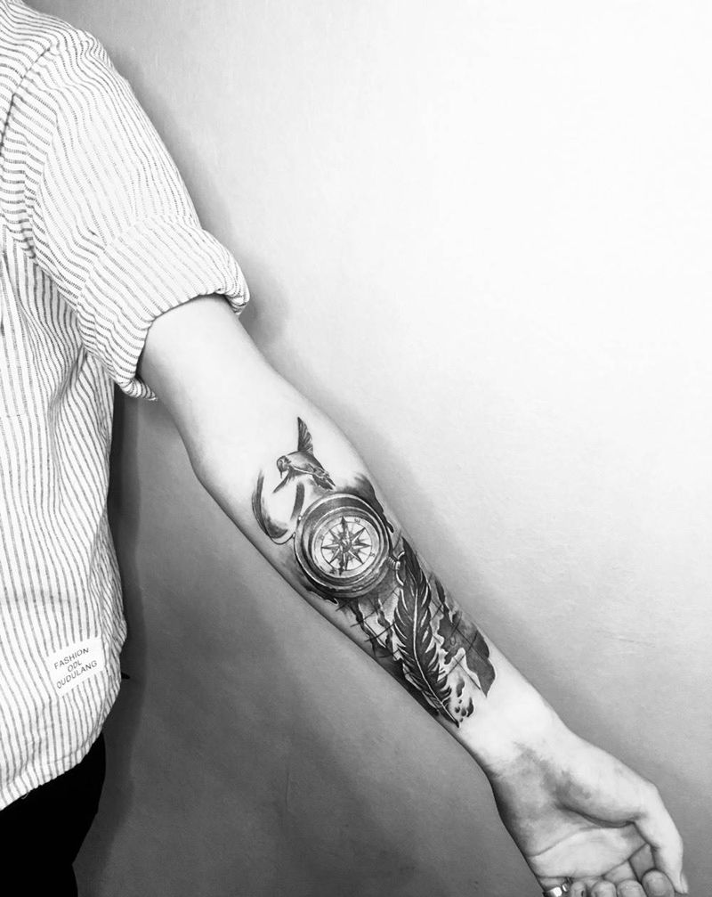 手臂 指南针 羽毛纹身图片_手臂欧美写实指南针羽毛地图纹身图案