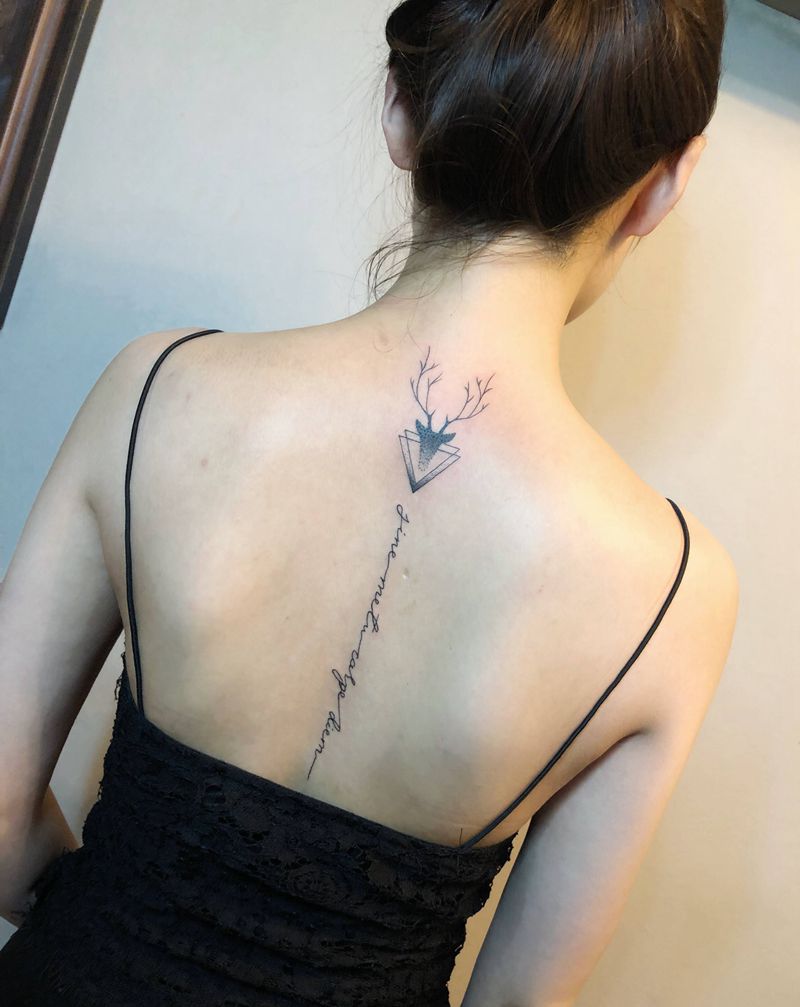 脊椎清新英文字母纹身图片_背部点刺几何鹿英文字母纹身图案
