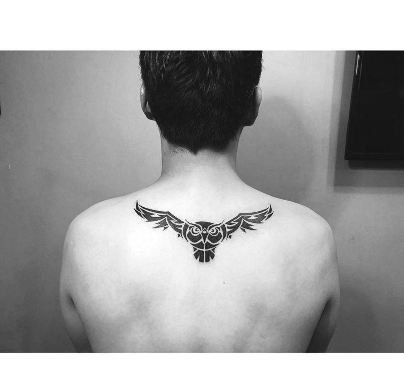后背猫头鹰图腾纹身图片_背部肩部图腾几何猫头鹰纹身图案