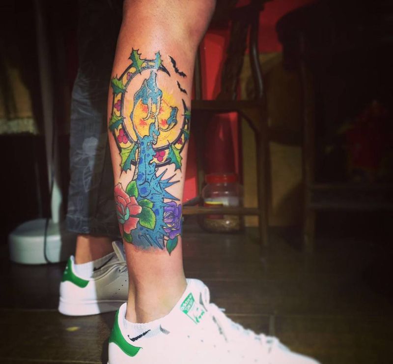 • T包小腿吹火男+阿多福纹身图片_腿部老传统新传统吹火男阿
