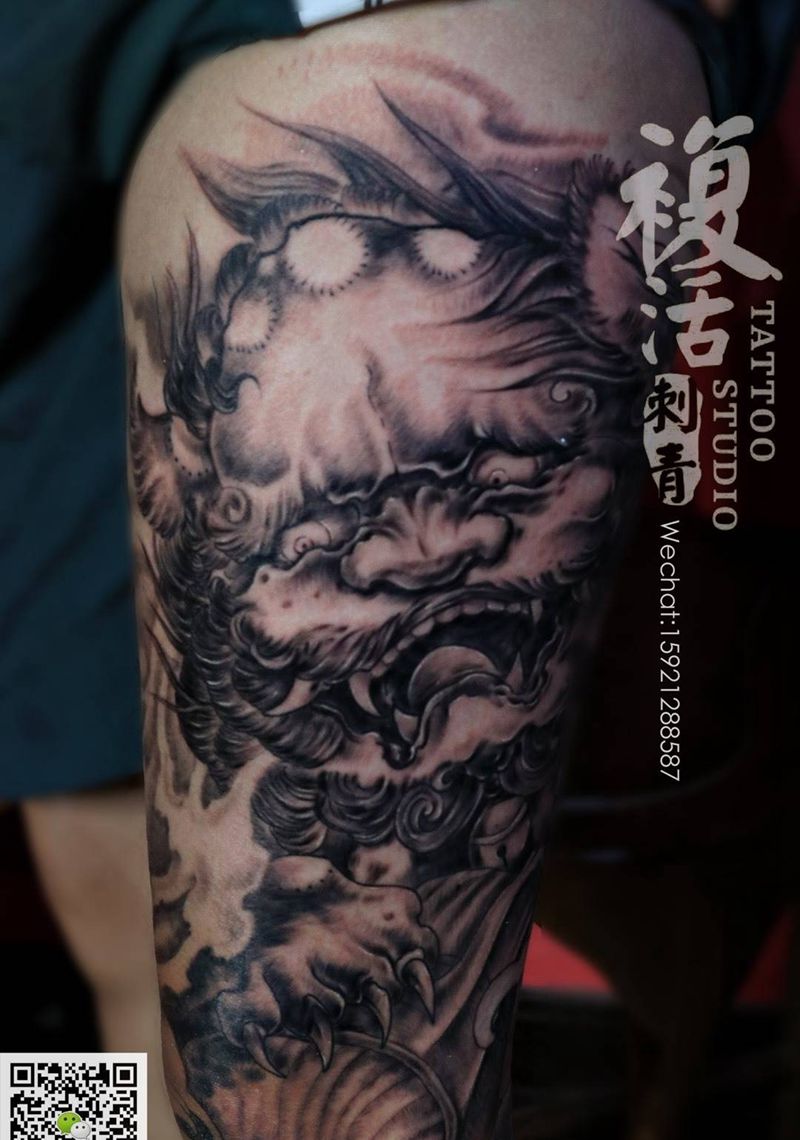 当前位置: 首页 >上海市纹身店-上海复活刺青纹绣工作室纹身图案>包腿唐狮纹身图片