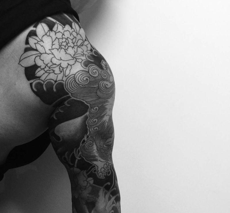 当前位置: 首页 >上海市纹身店-IRON HEART 強心紋身纹身图案>唐獅子牡丹(未完成)纹身图片_手臂传统动物原创設計未完成纹身图案