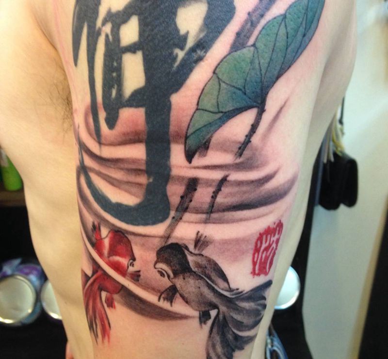 蓮 (原創)手繪直上纹身图片_成品手臂传统国画原创植物动物設計潑墨纹身图案