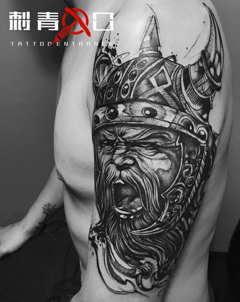 愤怒的维京人纹身图片_成品手臂欧美肖像写实几何人物图腾宗教纹身图案