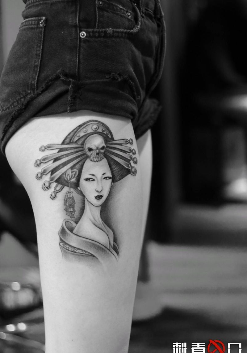 艺伎纹身图片_成品腿部传统习俗肖像人物纹身图案