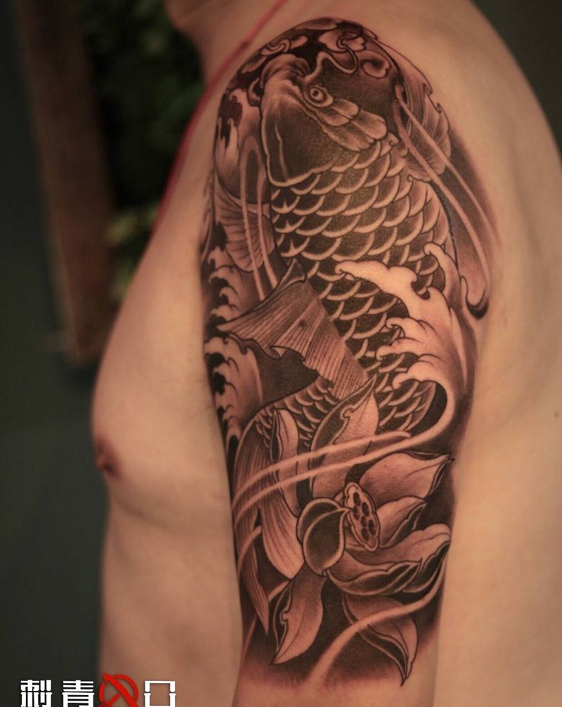 大臂黑灰鲤鱼纹身图片_手臂新传统鱼纹身图案
