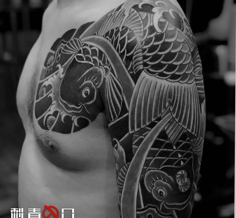日式传统半胛鲤鱼遮盖纹身图片_胸部手臂老传统鲤鱼遮盖半胛纹身图案