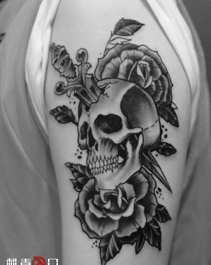 骷髅玫瑰纹身图片_臀部欧美写实New School骷髅玫瑰匕首纹身图案