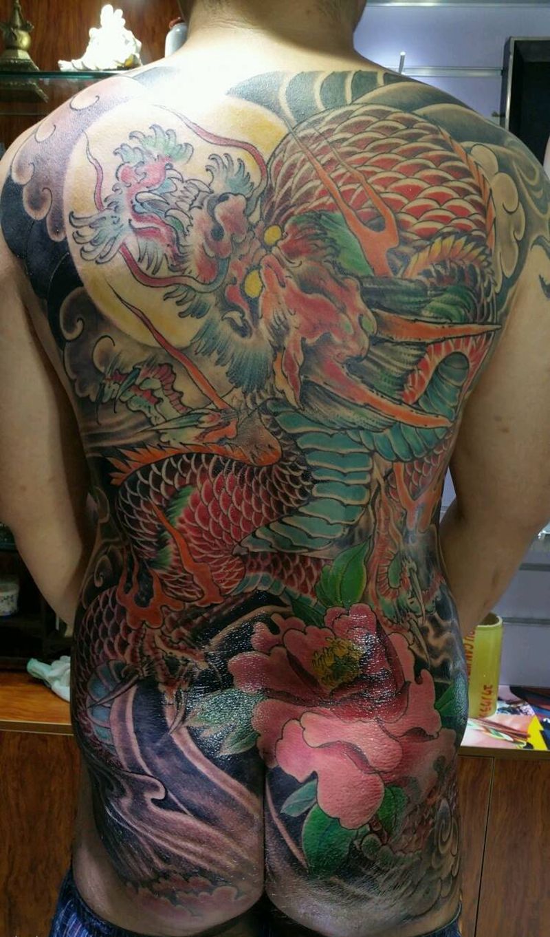 富贵牡丹与青龙纹身图片_背部新传统纹身图案