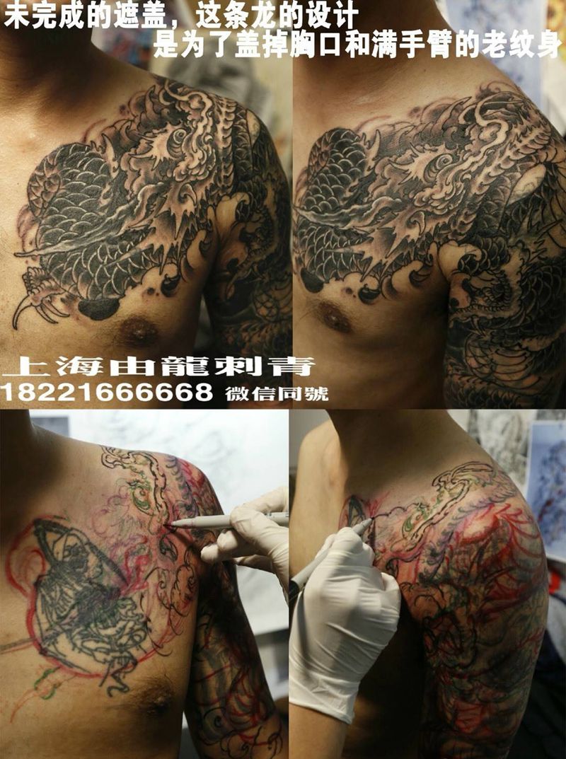 龙头胸口的遮盖纹身图片_动物胸部肩部背部传统手稿纹身图案