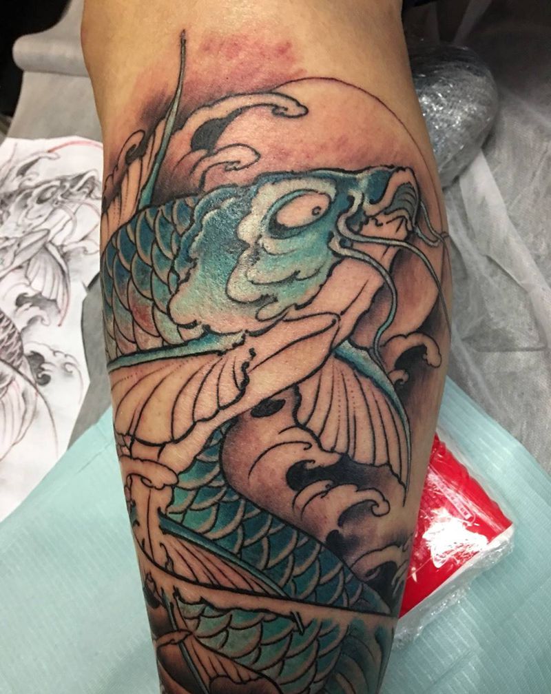 当前位置: 首页 >上海市纹身店-由龙纹身八佰伴工作室纹身图案>这一跃云开见日纹身图片_传统动物原创腿部纹身图案