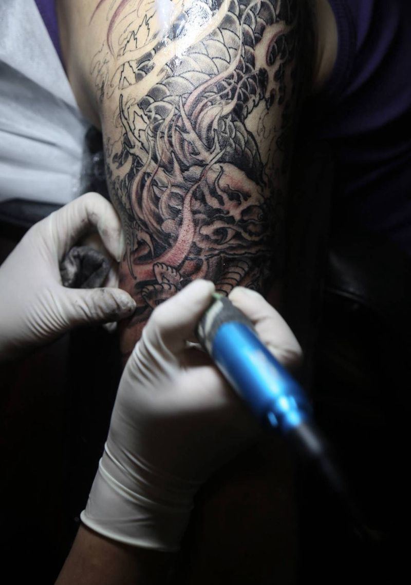 • T网红王老大花腿龙纹身图片_腿部新传统纹身图案