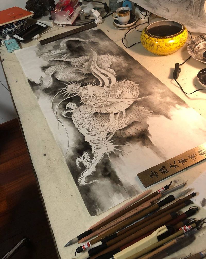 由龙绘制纹身图片_手稿传统动物纹身图案