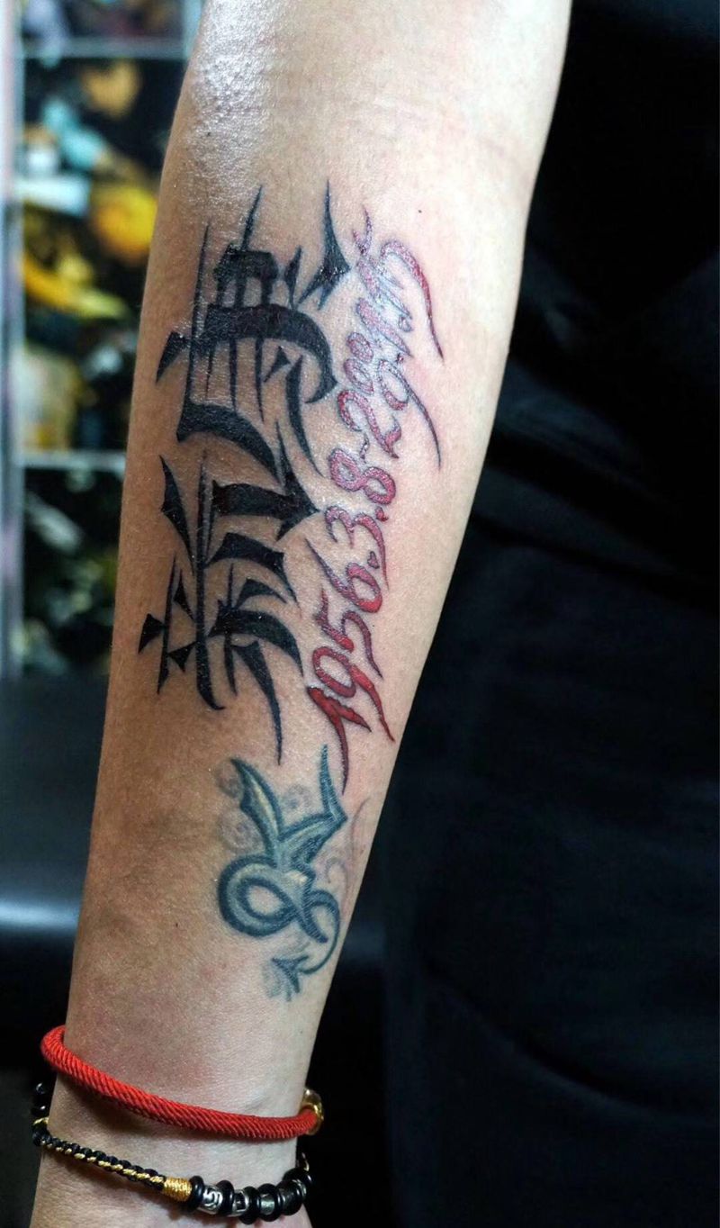 当前位置: 首页 >上海市纹身店-马刺纹身工作室纹身图案>怀旧感恩纹身图片_手臂花体字Old School自创设计纹身图案