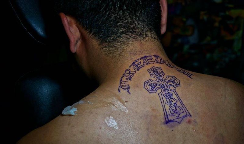当前位置: 首页 >上海市纹身店-马刺纹身工作室纹身图案>【上海马刺文身工作室】纹身图片_成品背部欧美宗教字符原创完全手绘纹身图案