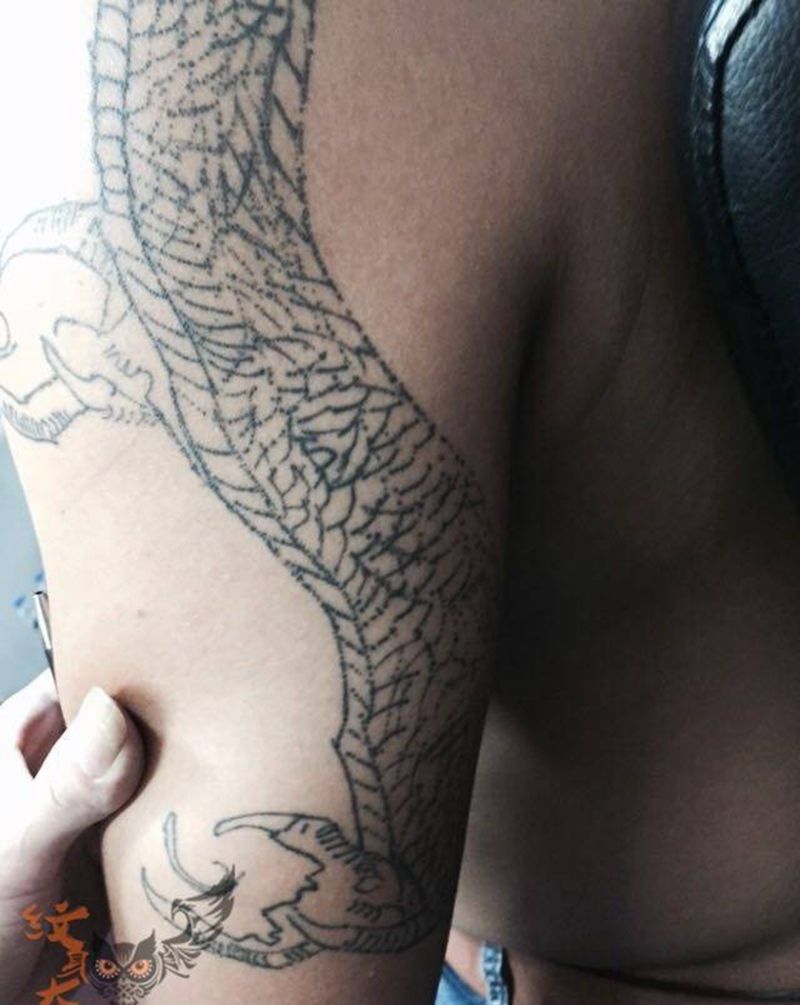 • T网红王老大花腿龙纹身图片_腿部新传统纹身图案