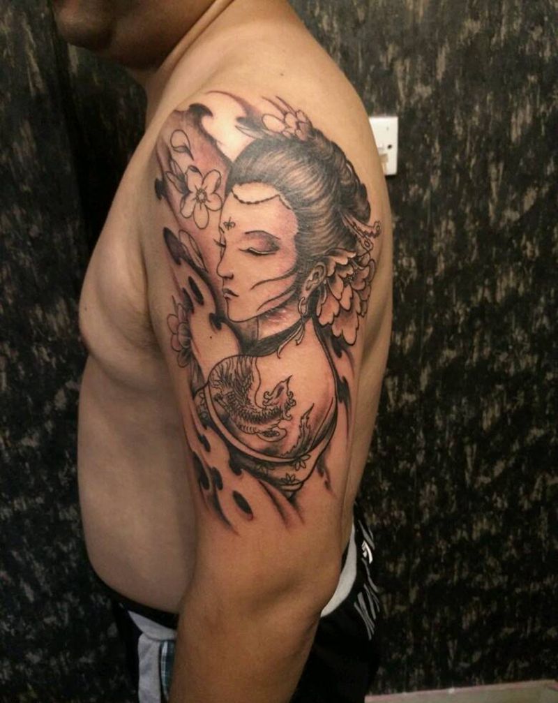 大臂艺妓纹身纹身图片_手臂传统人物成品纹身图案