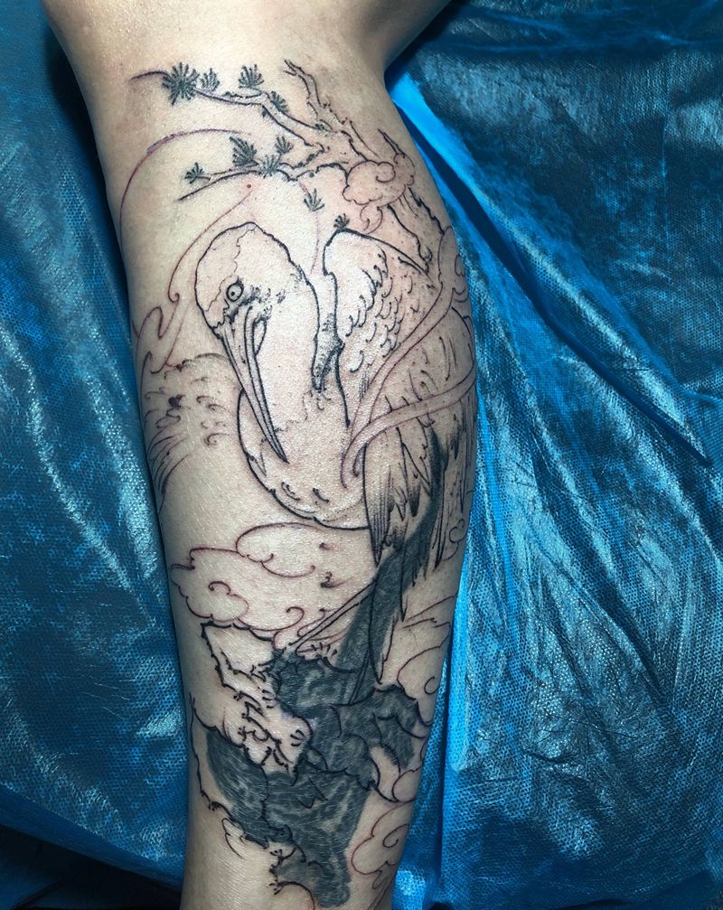 鹤,遮盖纹身图片_腿部新传统纹身图案