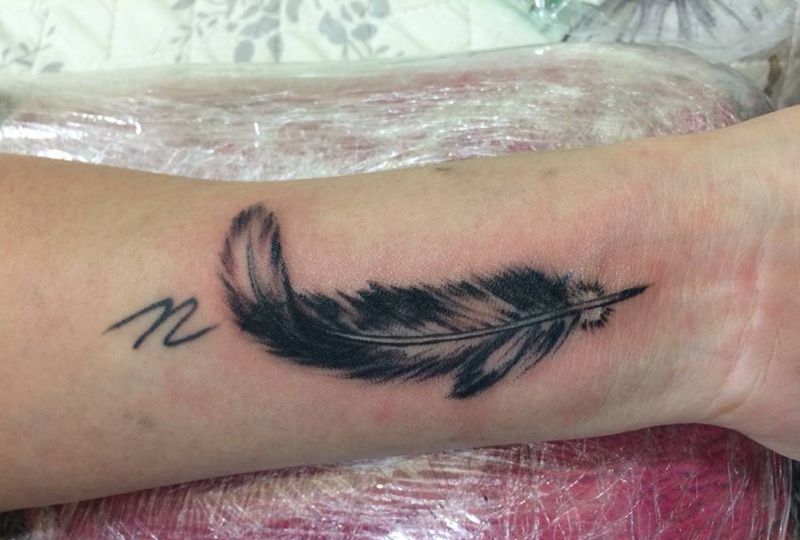 当前位置: 首页 >上海市纹身店-三郎艺术纹身纹身图案>第一个是用羽毛遮盖字母!纹身图片