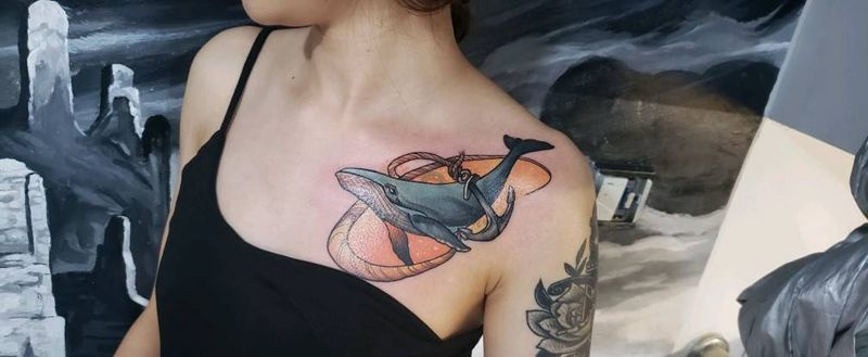 鲸鱼纹身图片_胸部New School鲸鱼遮盖锁骨纹身图案
