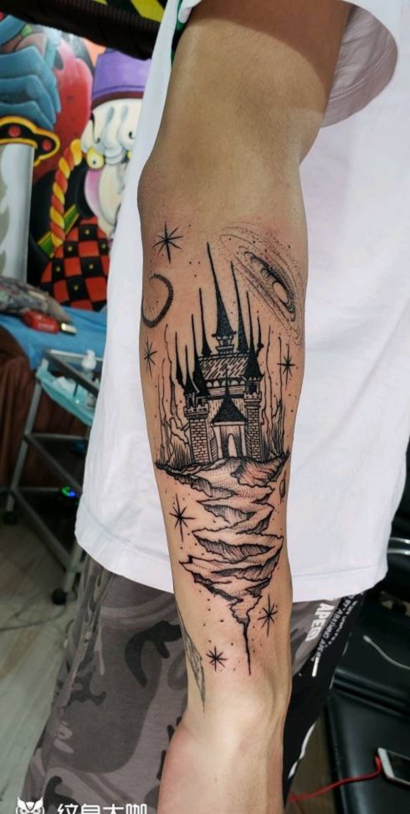 当前位置: 首页 >上海市纹身店-龙艺纹身纹身图案>暗黑城堡纹身图片_手臂暗黑纹身图案