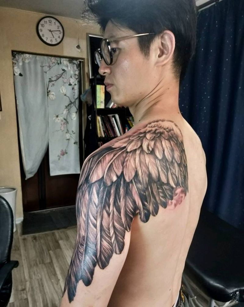天使的翅膀过程纹身图片_手臂肩部欧美写实纹身图案