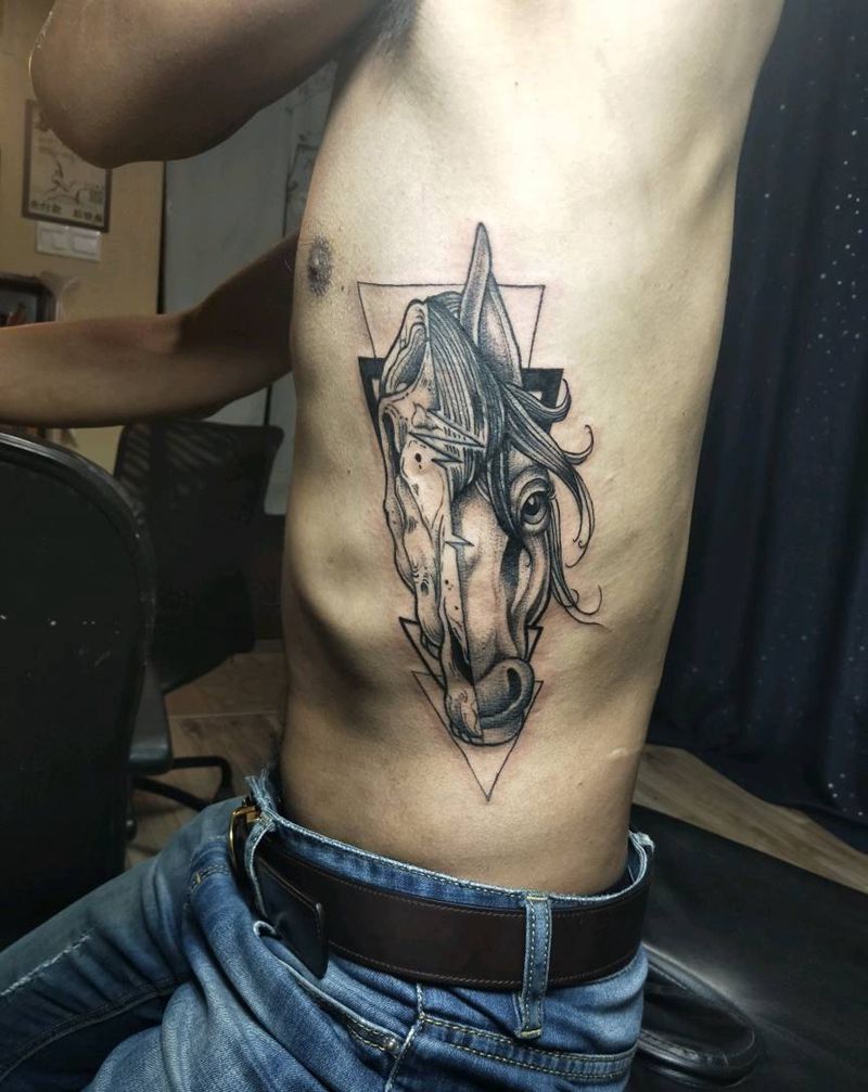 一匹马遮改纹身图片_腰部几何图腾纹身图案